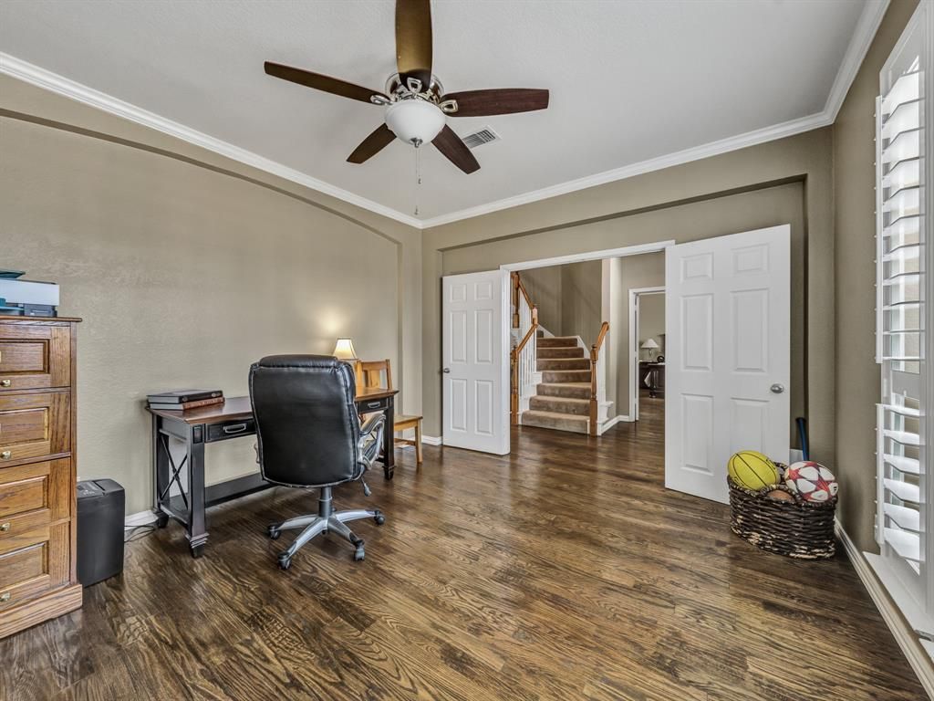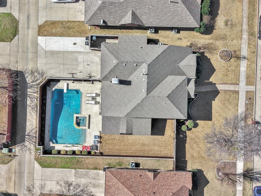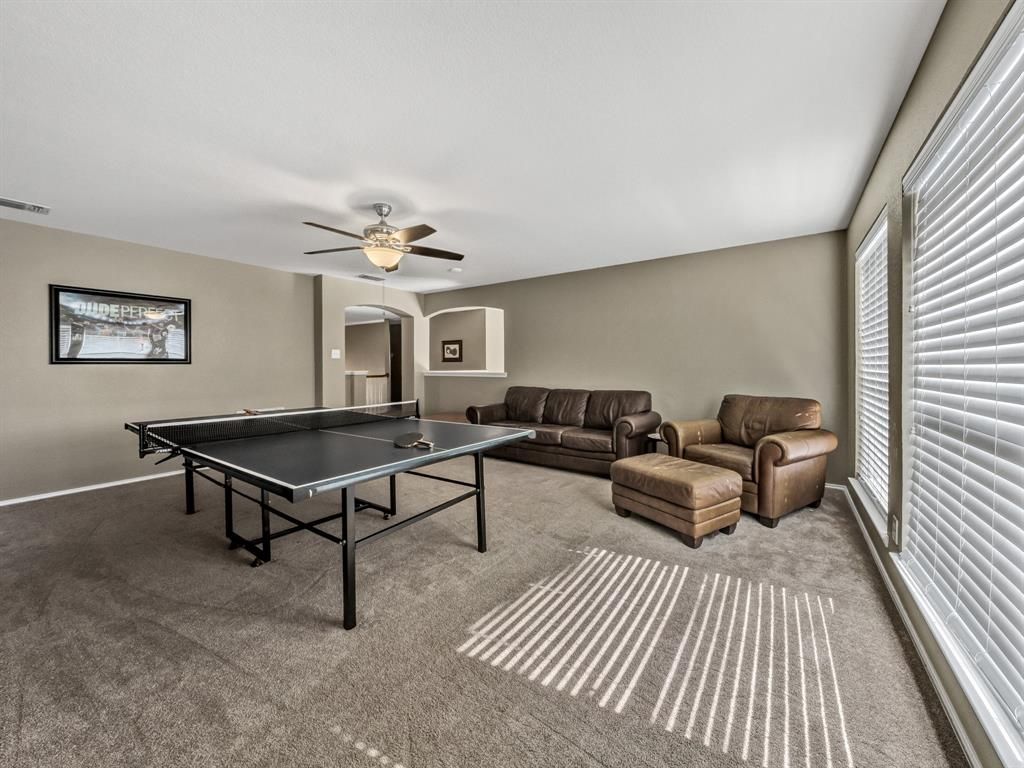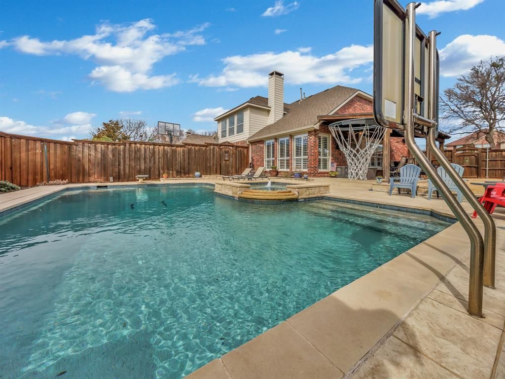 This wonderfully upgraded home welcomes you with hand-scraped hardwood flooring throughout the first level, seamlessly complemented by elegant travertine tiles in the kitchen and bathrooms. Inside, you'll enjoy a cooler atmosphere thanks to the plantation shutters. The kitchen boasts beautiful granite countertops, perfect for both cooking and entertaining. Adjacent, the living room features built-in shelves, offering ample space to showcase your favorite books, photos, or decorative items. Upstairs, you'll find not only a spacious bonus room, ideal for hosting guests or enjoying family game nights, but also an upgraded bathroom that adds a touch of luxury and convenience for both residents and visitors. The home also features a widened driveway with extra parking space, making it easy to accommodate multiple vehicles for family, friends, or guests without any hassle. An exterior enclosure next to the house supplies extra storage so gear stays neatly out of sight. Last but certainly not least, step outside to your extra large pool, complete with a diving board and a built-in basketball hoop, perfect whether you're a serious swimmer or just looking for casual fun. Soft poolside lighting along the fenced area lets you enjoy a refreshing swim even after sundown. Combined with an extended covered patio and two ceiling fans, the outdoor space invites your entire family to relax and enjoy nature without ever leaving home.