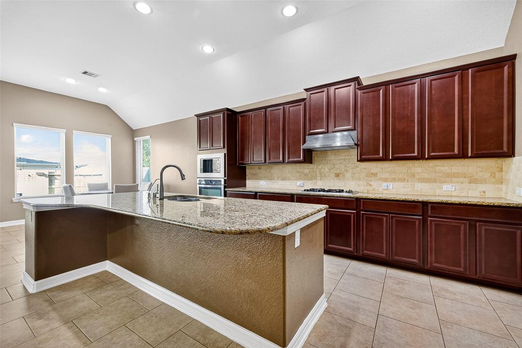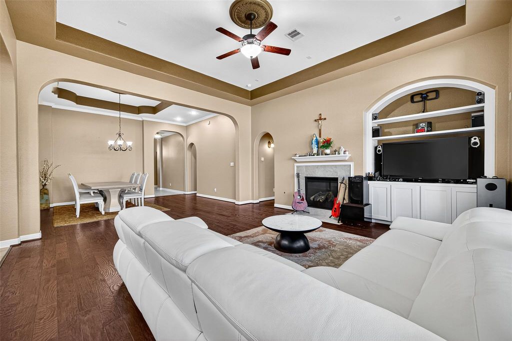 Step inside this inviting single-story home offering 4 bedrooms and 3 full bathrooms. A formal dining room welcomes you with crown molding and a tray ceiling, setting the stage for memorable gatherings. The living room combines warmth and style with rich wood floors, custom built-ins, a tray ceiling, and a gas log fireplace. Designed for the home chef, the kitchen showcases granite countertops, a travertine backsplash, stainless steel appliances, and an island with built-in shelving for extra storage. The primary suite features a vaulted ceiling and a luxurious ensuite complete with dual vanities, a soaking tub, and a separate shower with a bench. A spacious game room with built-in cabinetry provides the perfect spot for fun or relaxation, while three additional bedrooms and two full baths ensure comfort and convenience for everyone.