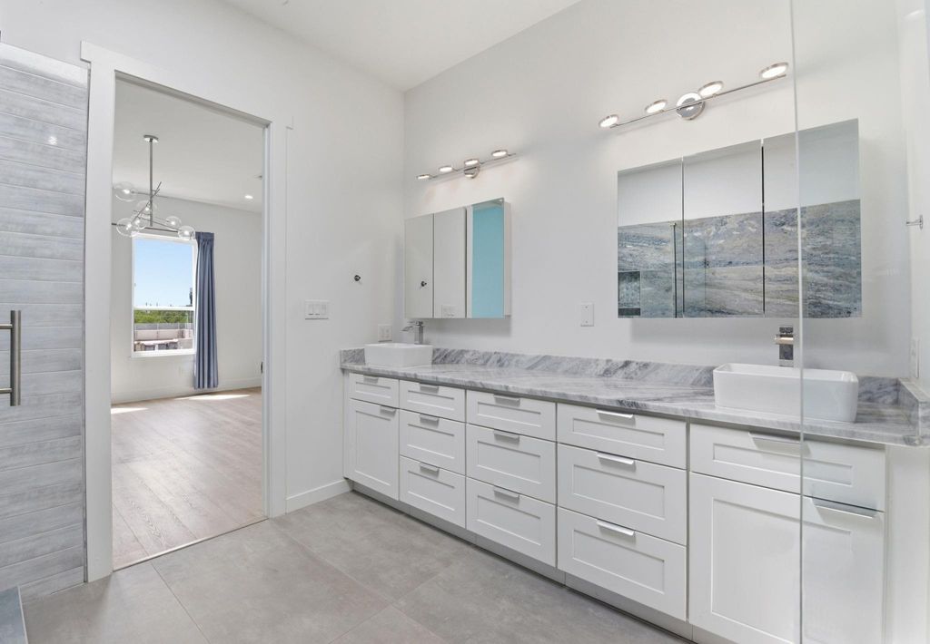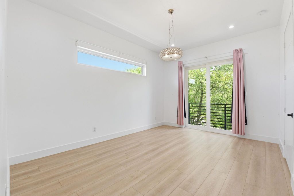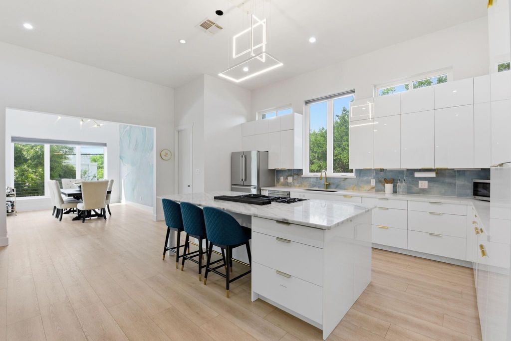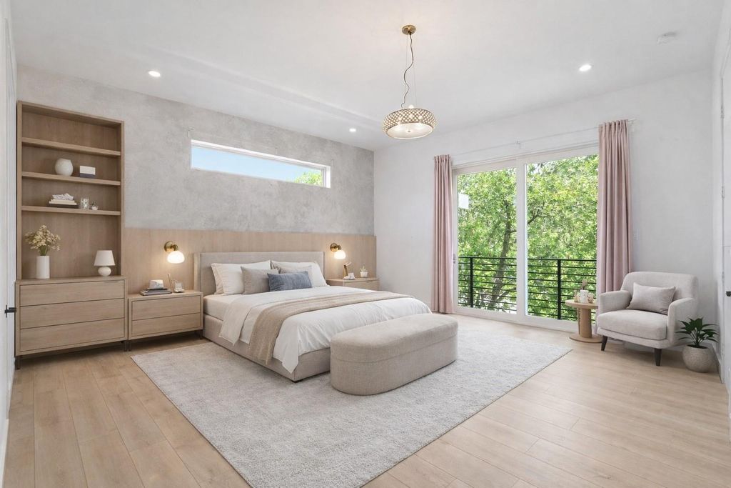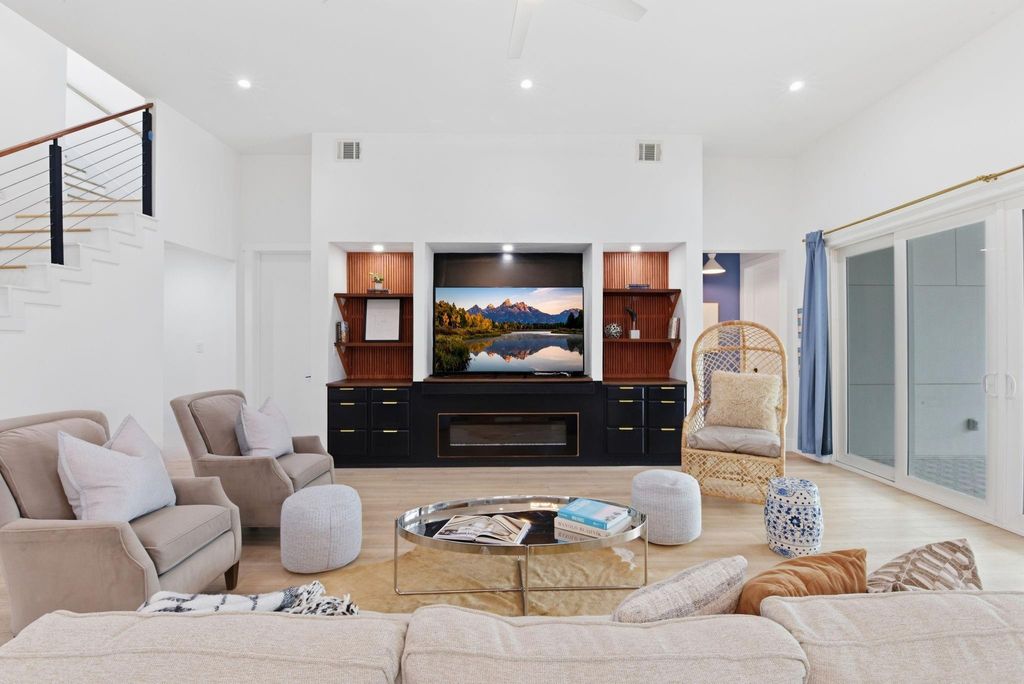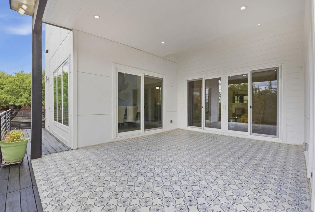 This modern 6-bed, 5.5-bath home offers nearly 4,900 sq ft of well-designed living space with a clean, streamlined aesthetic. Expansive custom windows and oversized sliding doors frame direct views of Karl Young Park and define the main living areas. The kitchen is centered around a large island with quartzite countertop and a Thermador 6-burner range. Two primary suites"”one on each floor"”offer flexibility, while bathrooms maintain a consistent spa-style finish. A custom dining mural adds a distinct design element. Two covered porches, two large second-floor balconies, and a pergola with turf yard extend the living space outdoors. Triple-pane windows along Stella Link provide strong sound reduction, creating a quiet interior. Elevated construction adds long-term resilience. A ~2,200 sq ft crawl space/garage offers exceptional storage. Solar power, EV charger, and generator-ready.