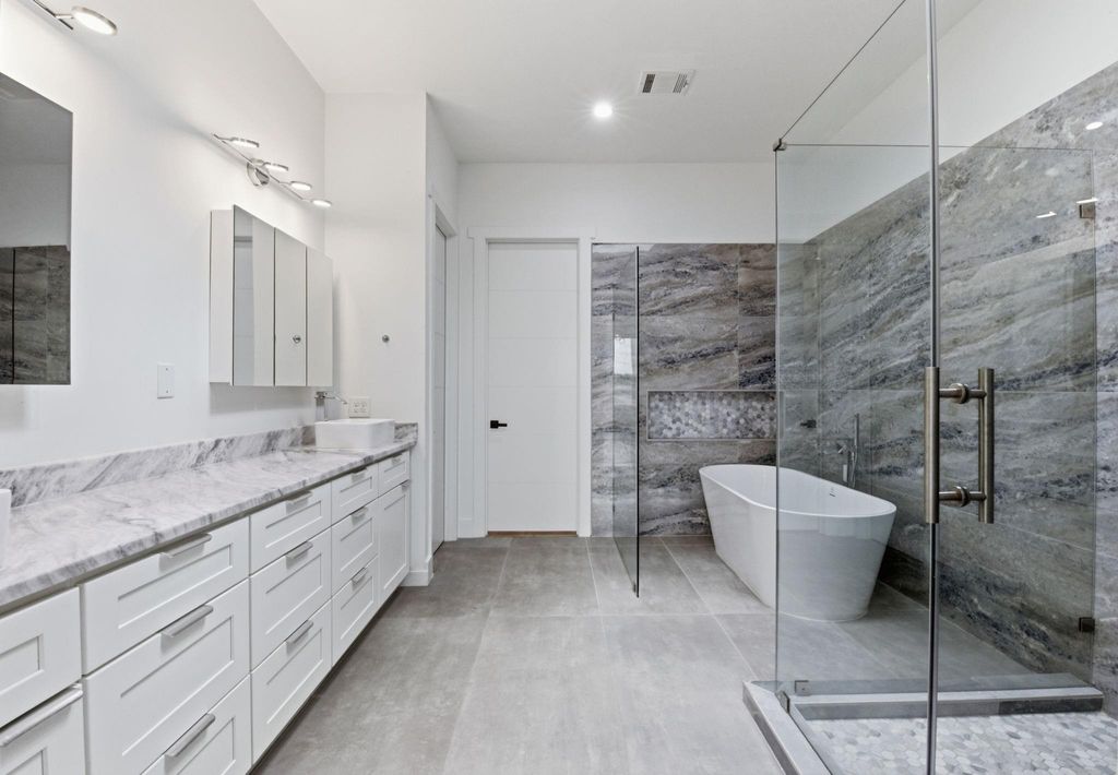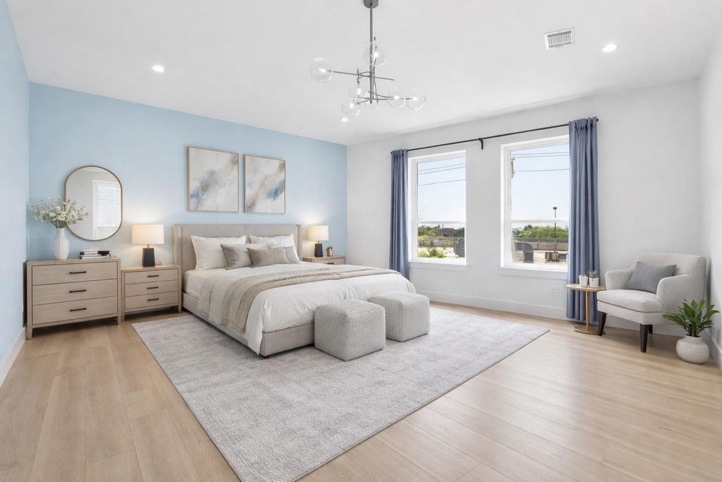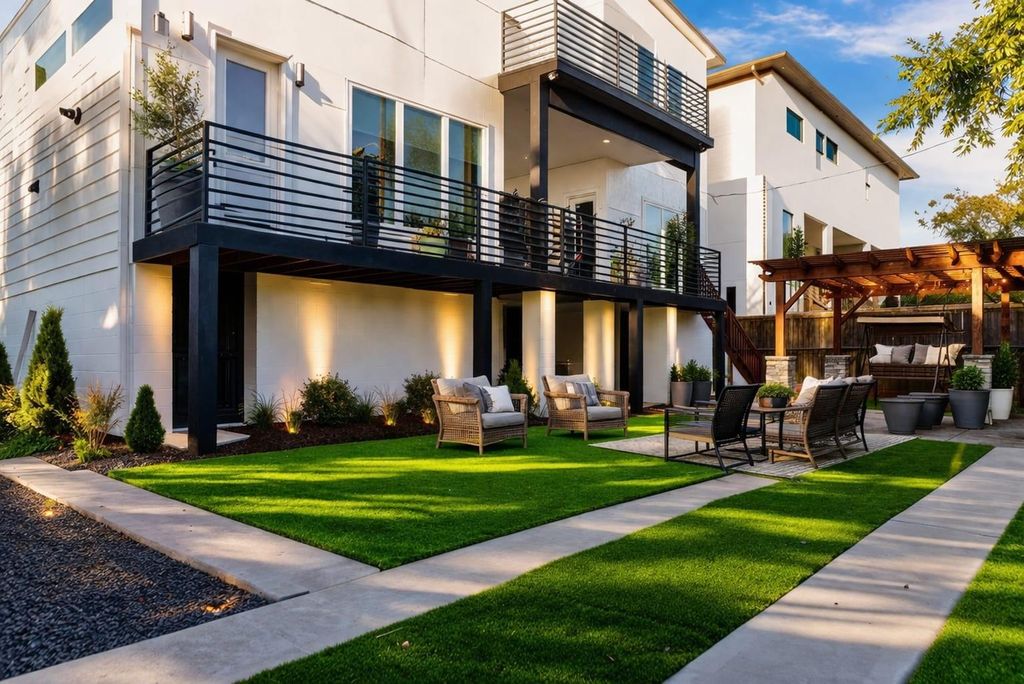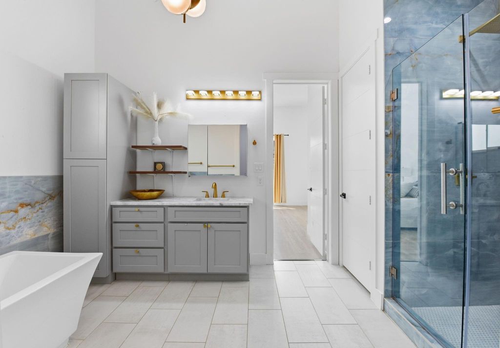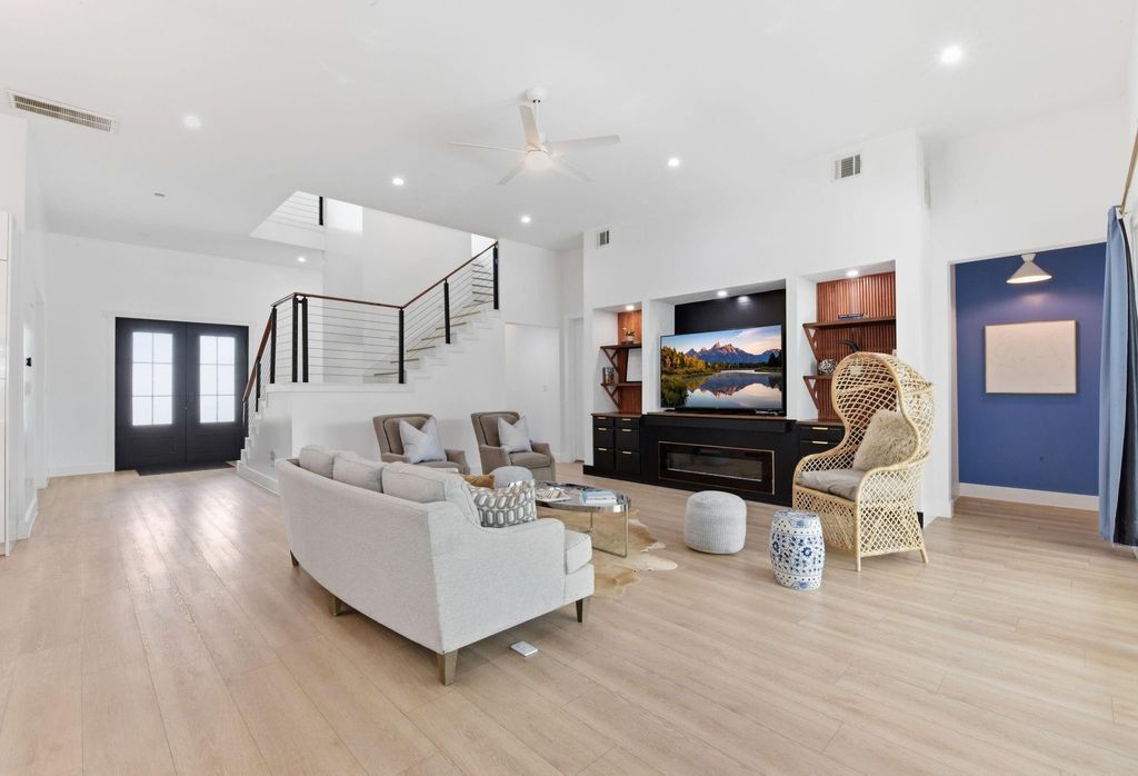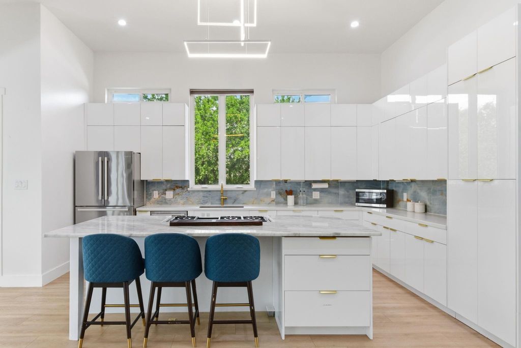 This modern 6-bed, 5.5-bath home offers nearly 4,900 sq ft of well-designed living space with a clean, streamlined aesthetic. Expansive custom windows and oversized sliding doors frame direct views of Karl Young Park and define the main living areas. The kitchen is centered around a large island with quartzite countertop and a Thermador 6-burner range. Two primary suites"”one on each floor"”offer flexibility, while bathrooms maintain a consistent spa-style finish. A custom dining mural adds a distinct design element. Two covered porches, two large second-floor balconies, and a pergola with turf yard extend the living space outdoors. Triple-pane windows along Stella Link provide strong sound reduction, creating a quiet interior. Elevated construction adds long-term resilience. A ~2,200 sq ft crawl space/garage offers exceptional storage. Solar power, EV charger, and generator-ready.